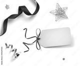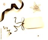 Design elements for Christmas background. Blank banner and holiday decorations, glittering confetti, Christmas golden star and red ribbon. Real soft transparent shadow. Clipping path, PNG