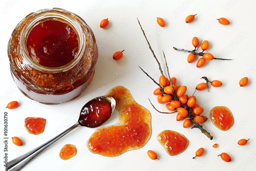 Sea buckthorn jam in a jar with a spoon and fresh orange berries on a white background. Photo from above.