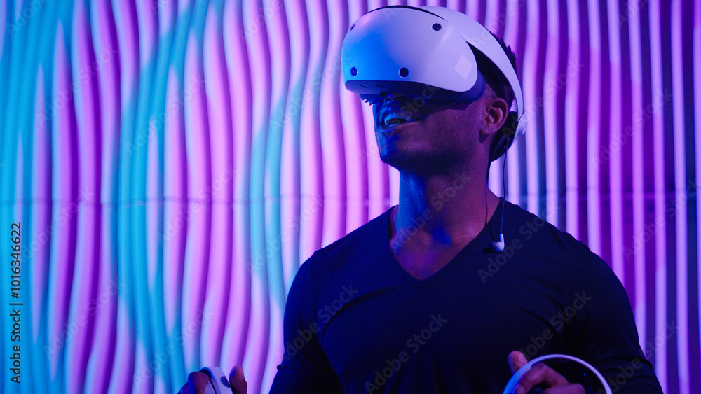 Excited African American man guy male gamer gaming vr play virtual reality glasses helmet internet game modern cyber technology neon futurism indoors futuristic metaverse playing software AR designer