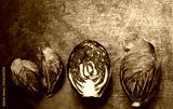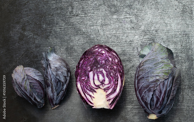 Several heads of red cabbage lie on the lower edge of a gray plate and are photographed from above. There is plenty of space for text