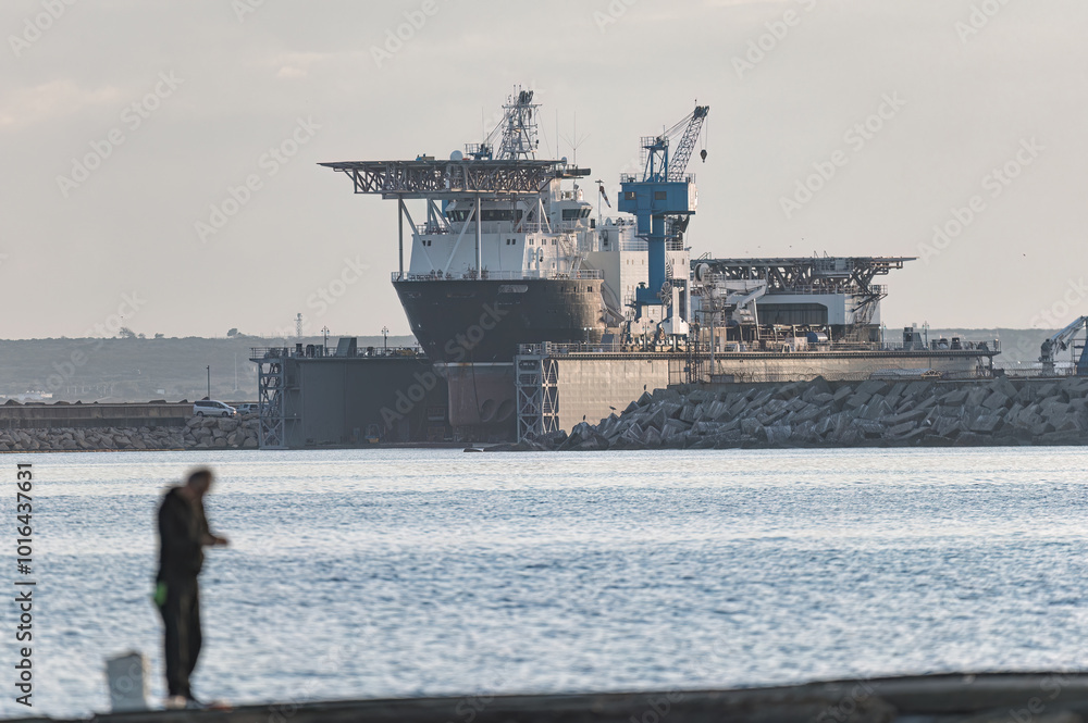 Fisherman fishing with large Special Purpose Vessels ship in drydock in background. Limassol, Cyprus