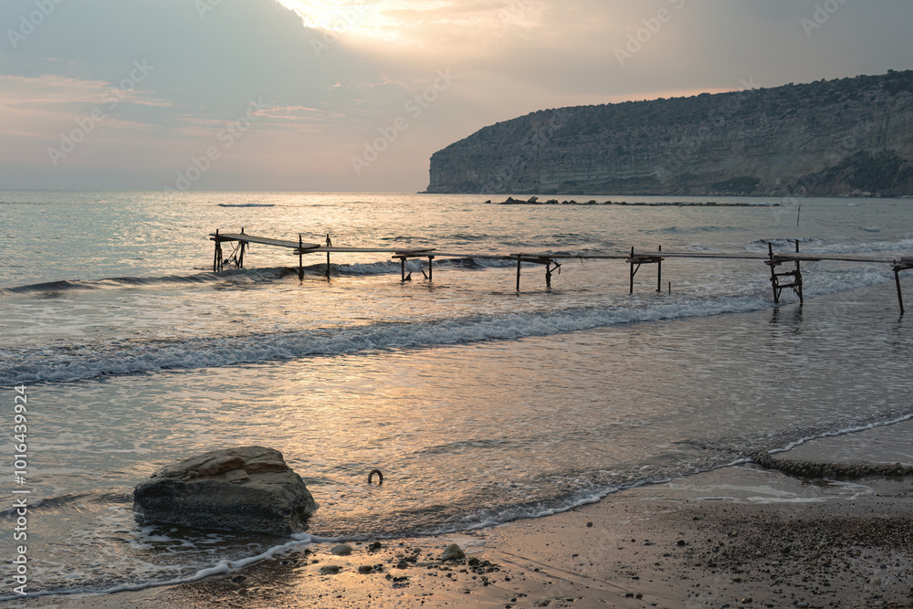 Sea waves crashing on Zapalo (Tripiti) beach at sunset with old pier and cliffs. Limassol District, Cyprus