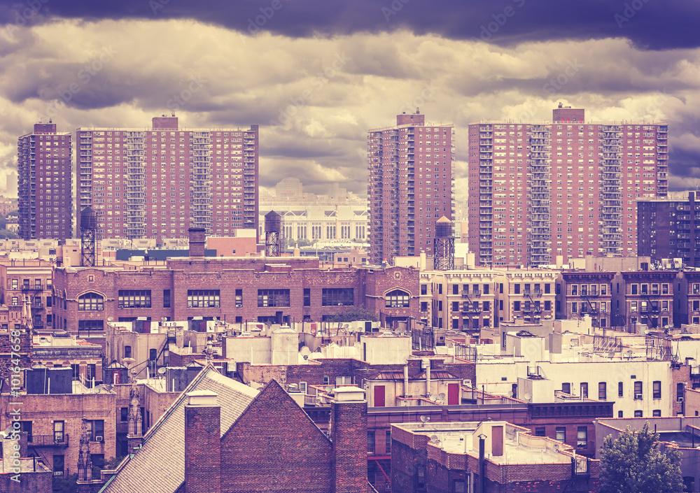 Vintage toned photo of New York residential buildings in rainy day, Harlem, USA.