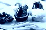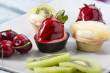 Variety of colorful mini tarts on plate.