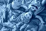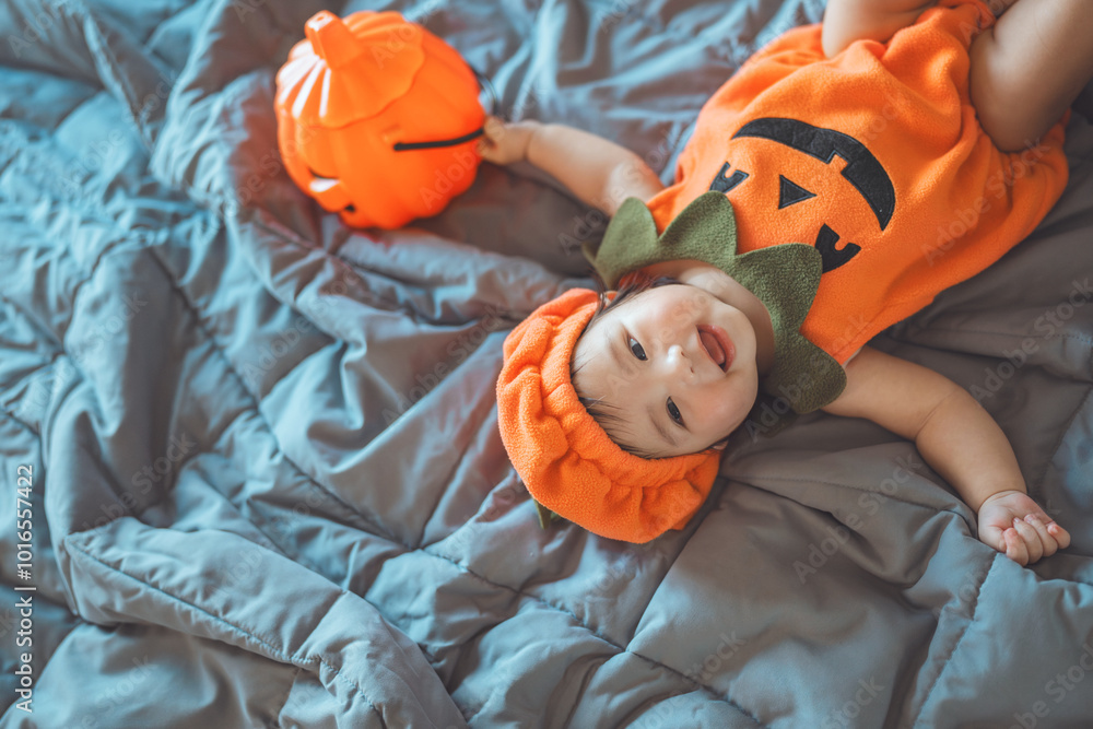 Happy cute asian newborn baby girl dressed in Halloween jack o lantern costume lying on bed with Halloween decoration, having fun and celebrating Halloween at home, copy space