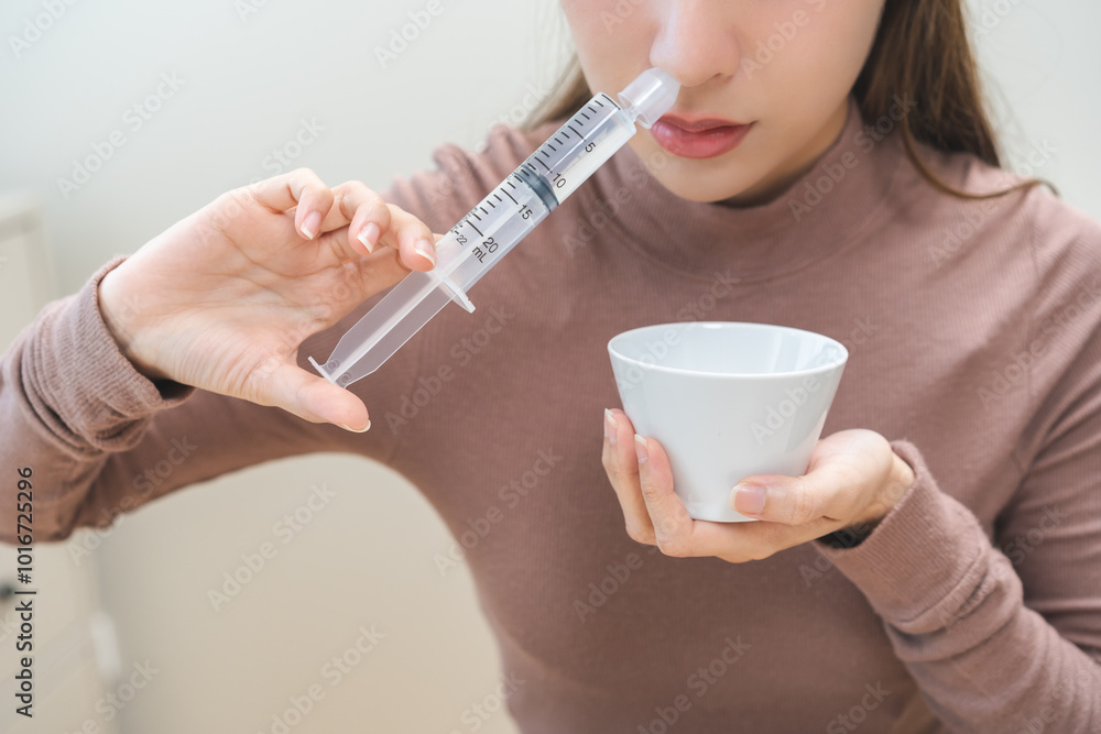Health care wash nose, cleaning nose concept. Nasal irrigation asian young woman illness have a flu, fever, have a runny nose. Girl washes out nose with syringe and saline, infection, dust allergic.