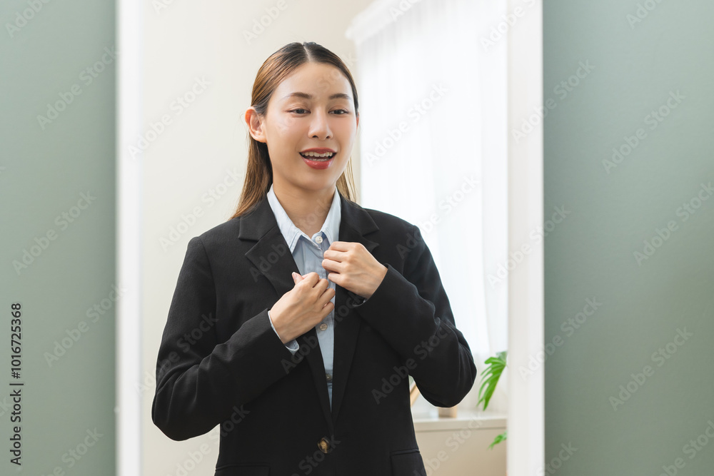 Get dress, pretty asian young woman, business woman standing wearing suit formal with shirt, female getting dressed preparing before go to work looking reflection in the mirror in the morning at home.