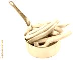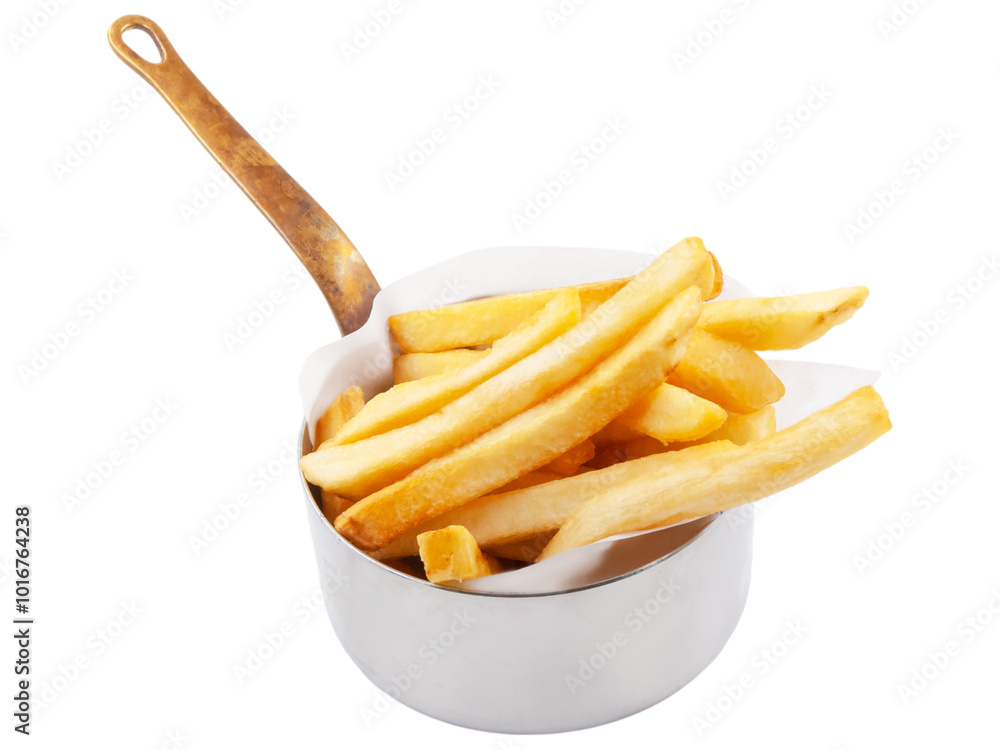 Golden French Fries in a Small Pot: Close-up shot of golden, crispy French fries in a small pot with a wooden handle, ready to be enjoyed. The fries are perfectly cooked, with a light.