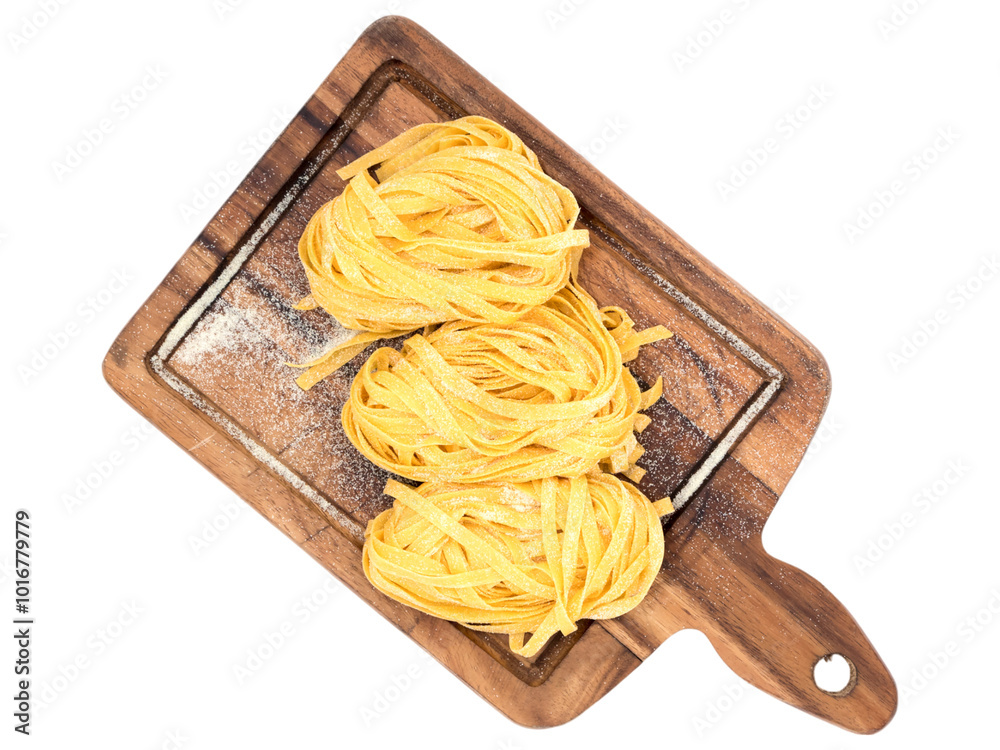 Golden Nest of Tagliatelle: Three perfectly formed nests of fresh tagliatelle pasta rest on a rich, dark wooden cutting board, ready to be cooked into a delicious Italian meal.