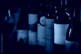Close-up view of various wine bottles, with a glass of red wine and grapes blurred in the background, creating an elegant and sophisticated wine composition Perfect for wine-themed compositions