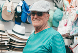 A smiling, cheerful senior man tries on a hat while shopping in a store. Elderly witty man looking at camera smiling