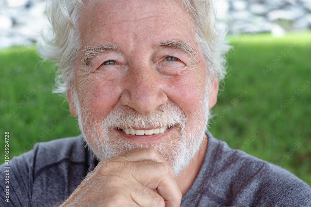 Portrait of attractive smiling senior man of 70 years old sitting in the park looking at camera. Elderly grandfather with white hair and beard relaxing enjoying a sunny day in outdoors