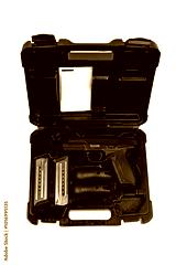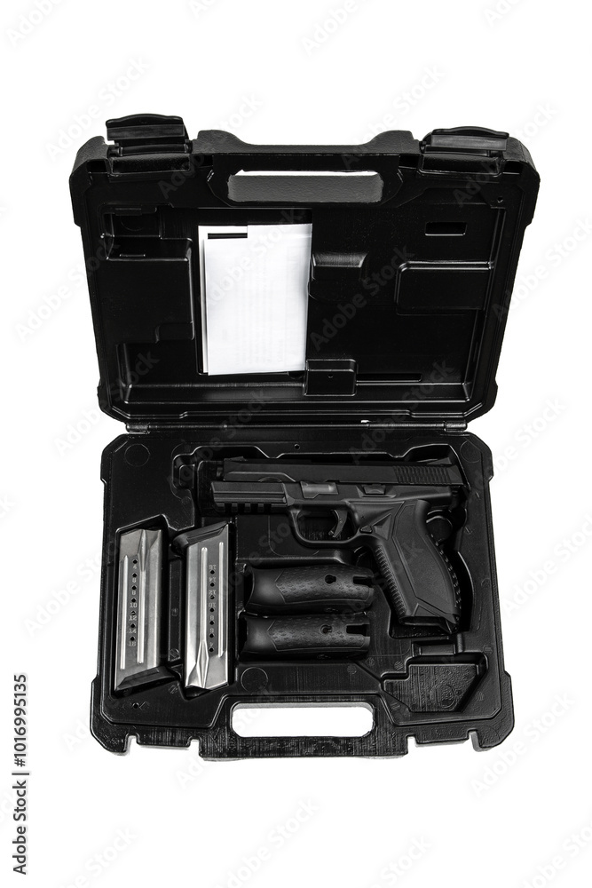 Modern semi-automatic pistol. A short-barreled weapon for self-defense. Arming the police, special units and the army. Weapon in a case for storage and transportation. Isolate on a white back.