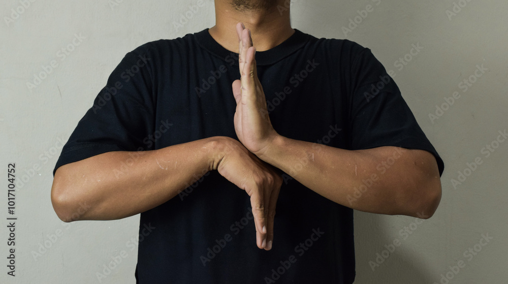Close up Asian man shows hand gestures it means human emotion and expression using sign language