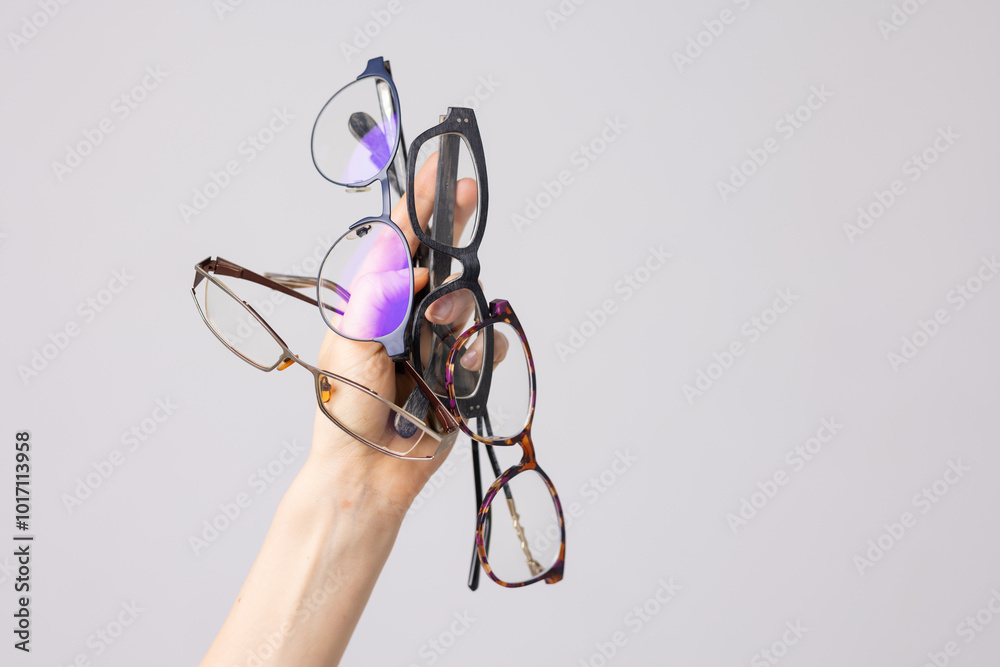 hand holding many glasses for vision on white background, good vision, selection of glasses