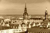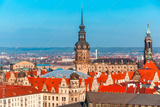 Aerial view over Royal Palace, river Elbe with Augustus Bridge, Hofkirche, and roofs of old Dresden, Saxony, Germany
