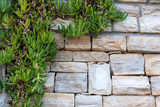 Curly green plants growing against a rustic brick wall in natural light. Concept of organic beauty, nature blending with architecture, and decorative greenery. High quality photo