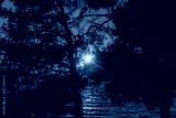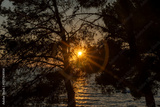 Stunning sunset through the pine trees overlooking the calm sea. Golden sun rays reflected in the water against the serene backdrop of nature. High quality photo