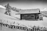 Untouched winter landscape. Wooden chalet on the hill of Alpe di Siusi village. Exciting winter sunrise on Dolomite Alps. Wonderful landscape of ski resort, Ityaly, Europe.