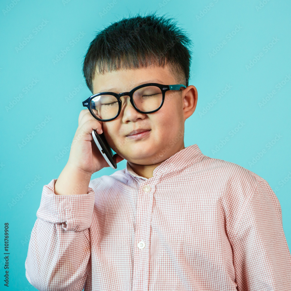 Happy little asian boy talking on smartphone