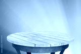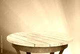 Round wood table top with abstract shadow drop on white wall background for mockup product display