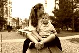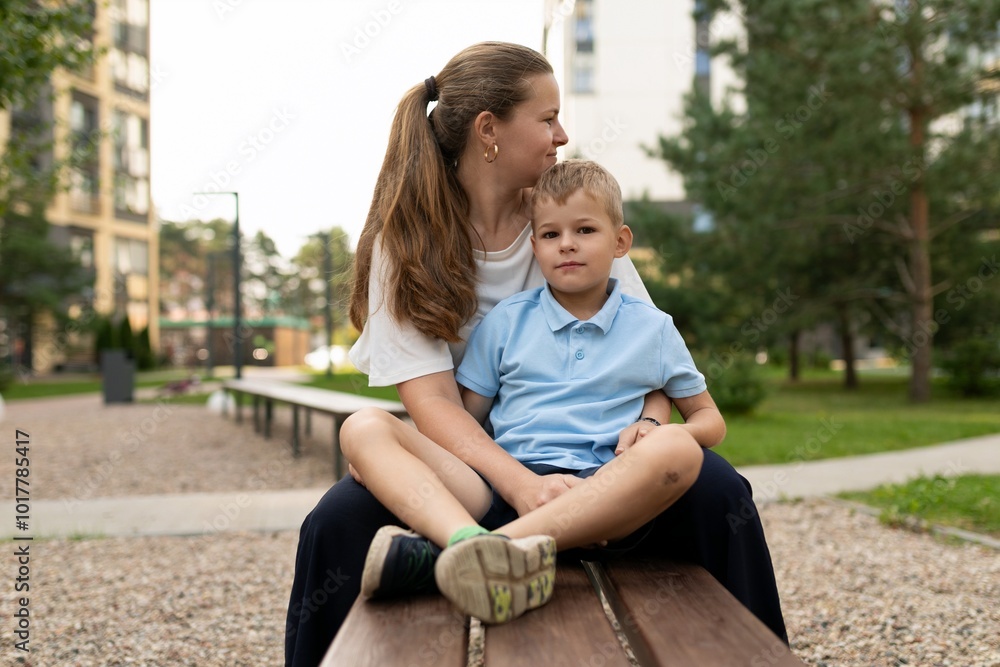 A mother and her son sharing a warm moment together while sitting on a bench in the park during the afternoon