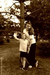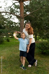 A joyful moment shared between a mother and son in a peaceful park during a sunny afternoon, standing beside a tall tree