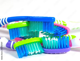 Viele bunte Zahnbürsten vor weißem Hintergrund