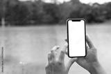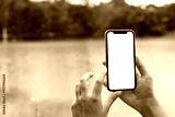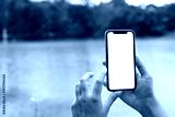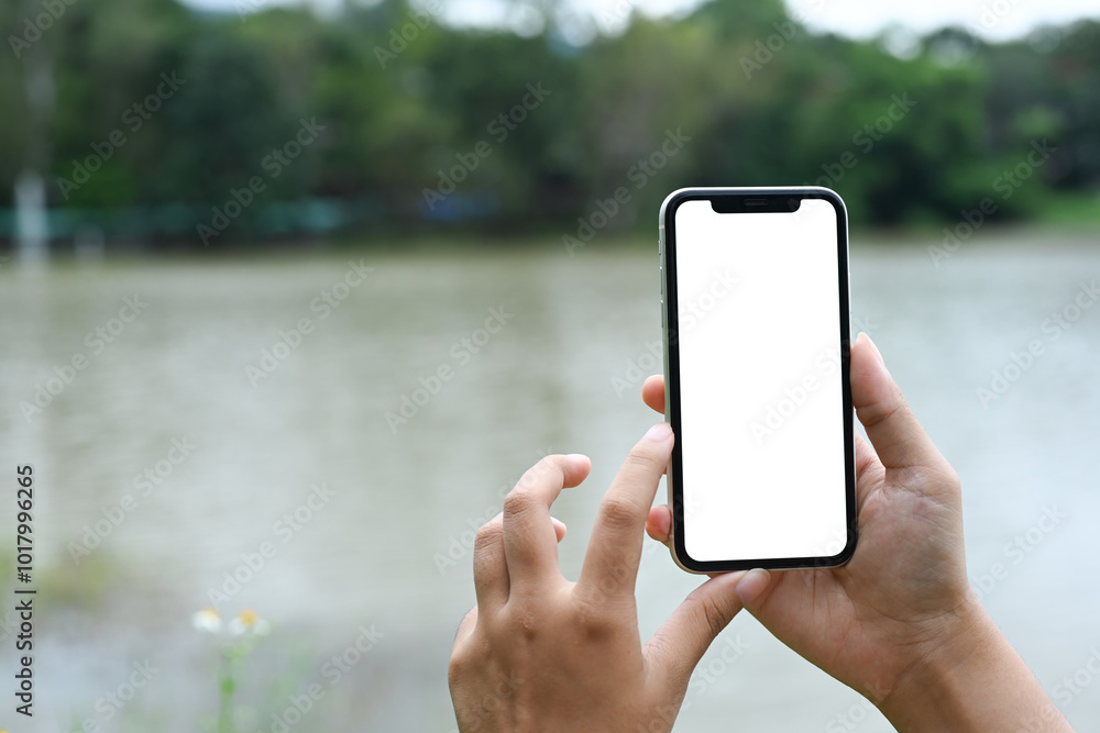Hands holding mobile phone with blank screen against background scenery with lake