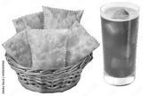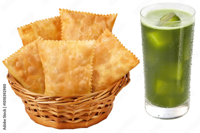 cesta de vime com porção de pastel frito acompanhado de caldo de cana gelado isolado em fundo transparente