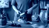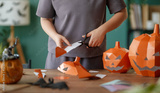 Woman is making Halloween paper pumpkins.