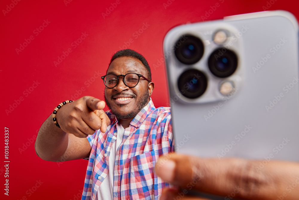 young african american man rejoices with hands to camera, isolated on red background studio portrait