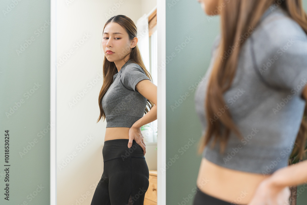 Excess weight gain, overweight asian young woman touching stomach wearing fit body clothes, dissatisfied about her body shape from fat around waist. Obese getting belly fat, diet, weight loss concept