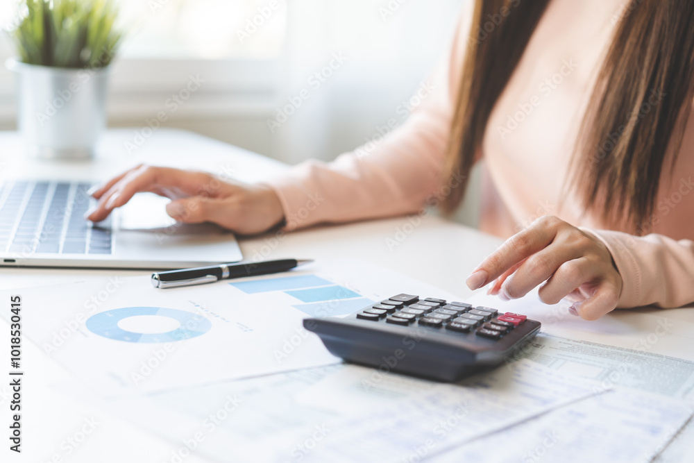 Deduction planning, debt asian young woman hand using laptop computer, calculator calculating money balance from bill and income, cost budget expenses for pay money form personal individual on table.