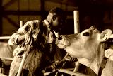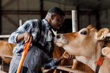 Happy African American man farmer worker hugging cow as sign of concern for animal health care. Concept farm agriculture cattle livestock farming industry