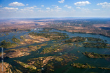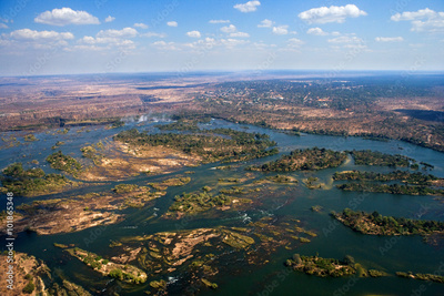 The Victoria falls is the largest curtain of water in the world. The falls and the surrounding area is the Mosi-oa-Tunya National Parks and World Heritage Site (helicopter view) - Zambia, Zimbabwe