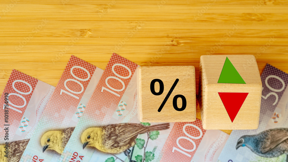 Wooden blocks with bank interest rate percent of bank with New Zealand dollar, Financial analysis, crisis project or economic growth concept. New Zealand money, close up, Flat lay background