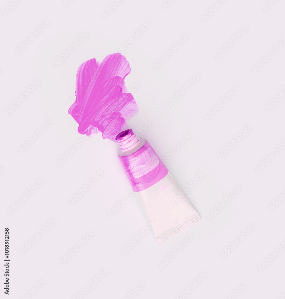 Acrylic, watercolor, oil paints in tubes, lilac pink brushstroke blot on empty beige paper background. Top view.