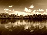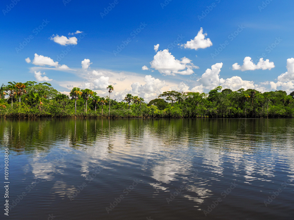 Landscape photograph of Amazon forest at river bank. Vibrant green of tropical vegetation, blue sky with white gentle clouds, mirrored in the clean river water.