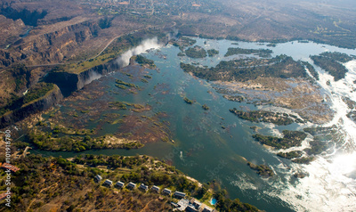 The Victoria falls is the largest curtain of water in the world. The falls and the surrounding area is the Mosi-oa-Tunya National Parks and World Heritage Site (helicopter view) - Zambia, Zimbabwe