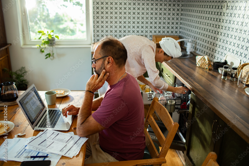 Man working on laptop with bills while woman loads dishwasher in kitchen
