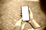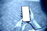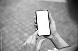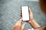 A close-up of a woman using her smartphone while walking on the street outdoors.