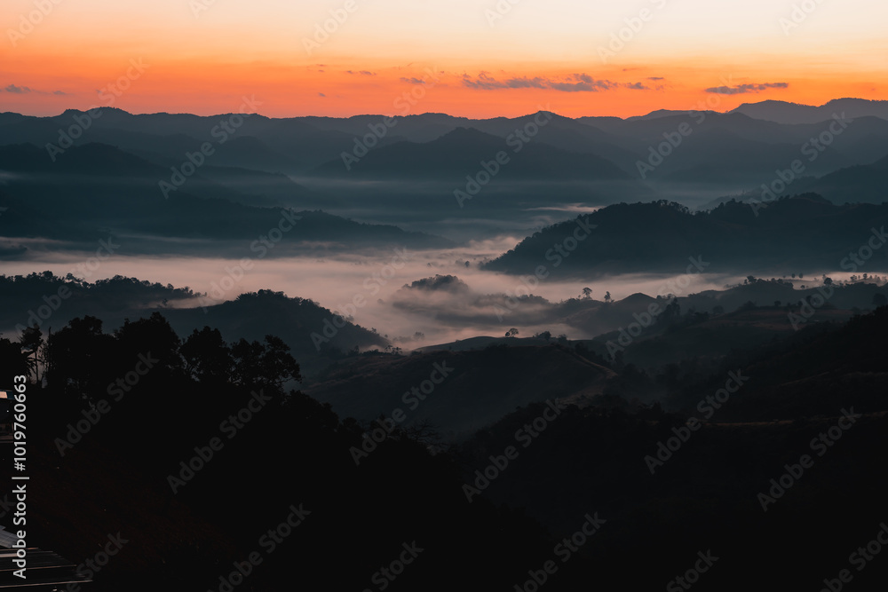 Mountain landscape, nature calm. Sunrise and there is mist in the mountains.