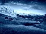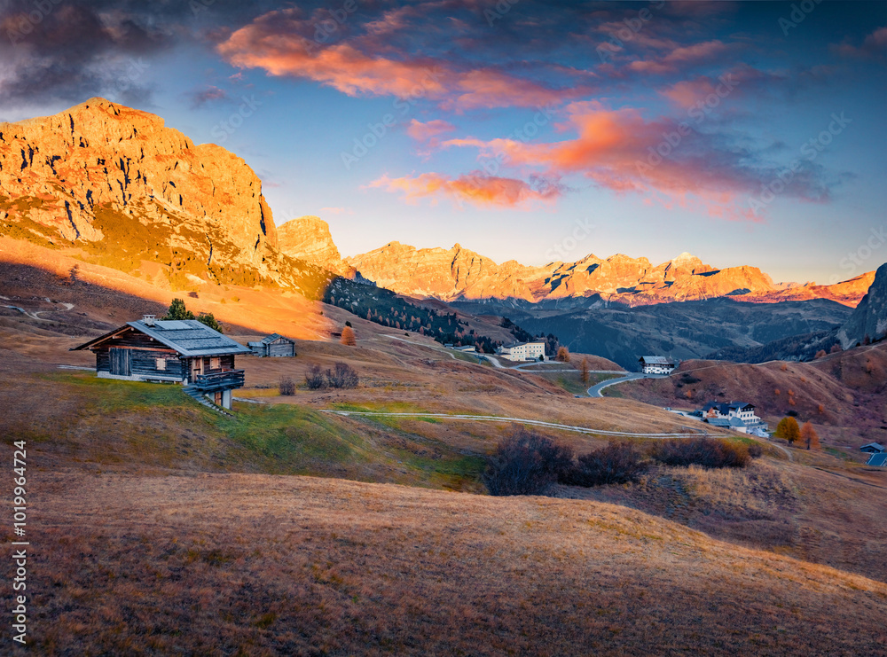 Amazing autumn sunset on Gardena Pass. Stunning evening scene of Dolomite Alps, Italy, Europe. Autumn in italian ski resort. Beauty of countryside concept background.