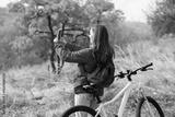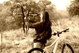 Young woman rest and take a photo by fall foliage after ride bicycle on the outdoor. Active sporty people. Fall activities
