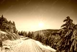 Winter snowy mountain with cross-country ski track at sunrise. Stunning trekking trail along mountain ridge