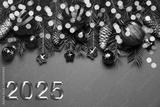 Christmas and 2025 New Year decorations on a green background. Red and gold layer, Christmas tree branches, cones.