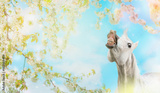 White horse smiling on spring blossom nature background, banner
