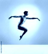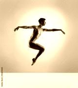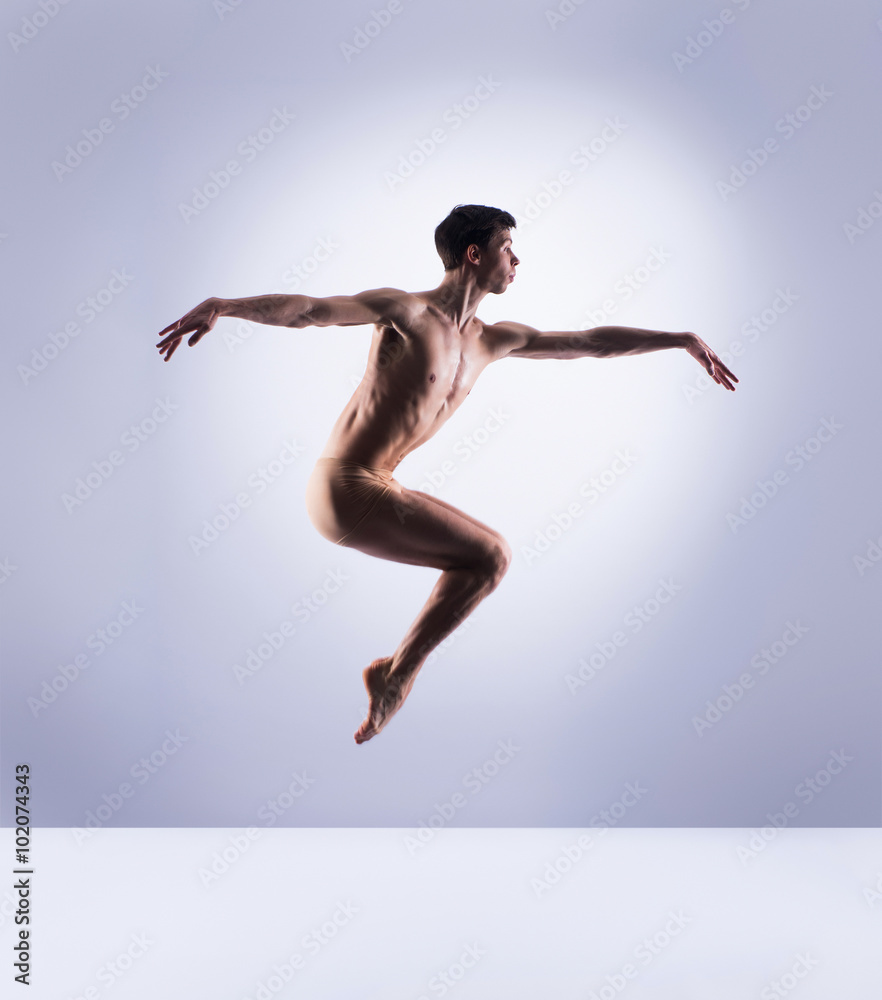 Athletic ballet dancer in a perfect shape performing over the grey background.