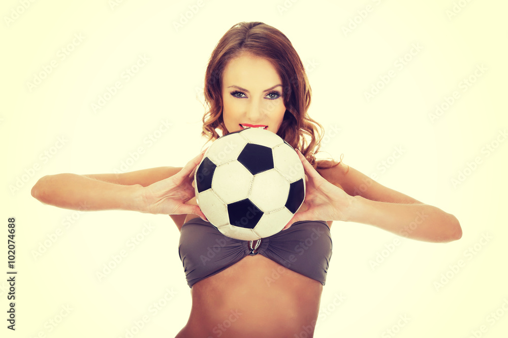 Woman in swimming bra with foot ball.